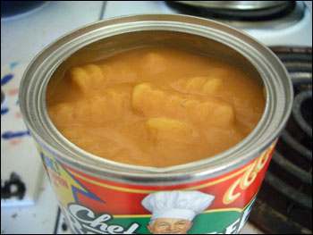 Now, as I said, it is not my intention to force the child into Boy-Ar-Subsistence — I made him a turkey sandwich with fresh tomatoes from our garden as a main course. As he ate his sandwich, I emptied the can into a saucepan and got to cookin’.