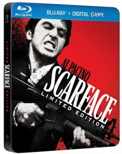 With this Limited Steelbook Edition of Scarface on my shelf has my search for the perfect version ended? In a way, yes–it collects the supplements from a 20th anniversary DVD (including, on a separate DVD, the Howard Hawks original, still in standard def, which needs to be sprung from its captivity and released on its own) and adds a few more, notably an interesting picture-and-picture feature exploring various facets of the movie and a “ScarfaceScoreboard” totaling the number of “fucks” and bullets (“Can’t you stop saying ‘fuck’ all the time?”). In a way, no–the image quality (1080p/VC-1; 2.35:1 aspect ratio) is inconsistent, with strong daylight passages giving way to weaker nighttime segments and a barrage of edge enhancement and other ills occasionally interfering. It’s serviceable, and a cut above the DVD, if not the quantum leap I expected.