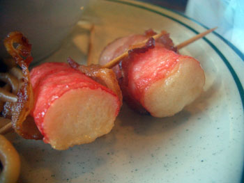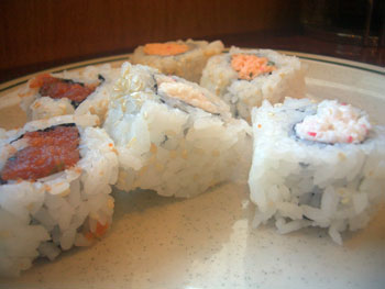 It all tasted disappointingly sane, I have to say. I mean, it isn’t crazy good, certainly, but I think that’s to be expected with the sitting out and the sneeze guard and all. But it isn’t that bad, either, especially considering it only costs $8 a plate for the lunch menu. I think we were all happiest with the rubbery steamed appleish rolls. In retrospect, we could have gone there for dessert, loaded up on those, and gotten our money’s worth. All in all, it’ll do in a pinch if you’re absolutely starving for spicy tuna rolls and soft-serve ice cream. I guess.