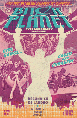 Bitch Planet makes no bones about being a dangerous object. The bold, garish cover art seems made to be viewed under a black light. The color registration is purposely off, for an artful shoddiness recalling the look of a low-budget samizdat tract. But peer beyond the lurid exteriors of Bitch Planet — the first five issues of which are collected in the new trade paperback Extraordinary Machine — and you’ll find in its back pages footnotes on intersectional feminism, and a discussion guide for book clubs. Plainly, there’s more going on here than cheap thrills.