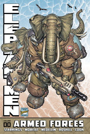 Genetically bred human/animal hybrids, the Elephantmen were created for war. Imagine hippopotamuses and rhinoceroses that walk like men tearing through the countryside, trampling everything under their feet. Sent into Europe to wipe out the last remnants of a deadly virus, these living and breathing tanks roll over the continent, killing every living thing. Richard Starkings’ Elephantmen Volume 00: Armed Forces is actually the fifth volume of his epic (is it still too early to call Elephantmen an ”epic”?), serving as a prequel to the previous four volumes. In Elephantmen, we’ve come to know characters like Hip Flask (a hippo) and Ebony (an elephant) as cops and detectives, investigating crimes by and against their fellow Elephantmen but in Armed Forces, Starkings shows us these creatures as the war monsters that they were created to be.