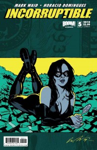 Be that as it may, apparently Waid doesn’t feel like he’s exhausted the subject, so here he is at Boom!, and here we have Incorruptible, which deals with (since this is a Boom! property, always with one eye on Hollywood and TV) a Clive Owen lookalike former supervillain named “Max Danger” who, when confronted with the threat of an insane Superman-like being, has decided to go straight in the hopes of averting the same fate that many of his peers, both presumed good guys and bad guys, have met — i.e., total obliteration. He’s accompanied in this task by a young girl in fetish gear, who aptly enough goes by the name of “Jailbait,” as well as a balding, cynical police captain he’s had an adversarial relationship with throughout the years.