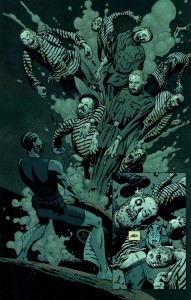 While some would disagree, I’m sure, I’ve always been of the opinion that Hellboy’s pal Abe has always gotten the short end of the stick when it comes to solo showcases. Uninspired stories, grubby, lackluster art, you name it. Finally, however, I’m happy to say that I think they got it right for once this time. Big ace in the hole here is Snejbjerg, last seen bailing early on The Mighty for DC (but it was OK- they tabbed Chris Samnee to take his place there, and he was outstanding); he’s capable of doing justice to any kind of script with his Corbenesque style. He’s not called on for a tour de force here, though; the mood is low-key, pervasive creepiness as the BPRD is called in on a undersea salvage mission, to retrieve an occult (of course) Macguffin (in this case, an immortality-providing helmet) from a sunken Russian submarine that went down in the late 1940’s. Problem is, at least one of the crew doesn’t want to give it up. Fairly standard setup, but Arcudi, by now an old hand at writing the Bureau,