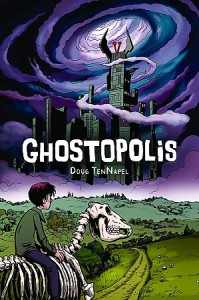 Let’s go ahead and get the obligatory-when-discussing-TenNapel Earthworm Jim mention out of the way right now. Yep, he created that character, and has done a ton of other work, mostly in the animation field. The Wiki, if you please. OK, now that that’s done, let’s get to the matter at hand- Ghostopolis. It’ss quite an involved read; TenNapel throws a lot of stuff out there, some of which is pretty clever, albeit borrowed and repurposed from films like Men in Black, The Frighteners, or Ghostbusters… not much you haven’t seen before, but arranged skillfully for the most part. Young Garth Hale is dying of a terminal illness; we see him and his mom after a visit to yet another doctor, who has the same doomed prognosis. At the same time, burned-out ghost hunter Frank Gallows is doing his job, pursuing spirits and sending them back to the titular city in the Land of the Dead, and while pursuing a skeletal horse-ghost, accidentally sends Garth there. Of course, this gets him in Dutch with his superiors, so they fire him. Determined to set things right, Frank enlists the aid of ex-girlfriend (in more ways than one) Claire, who also just happens to have a supernatural vehicle that will enable them to cross the barrier in search of him. As it turns out, when Garth is on the other side, he has powers, and those powers bring him to the attention of Ghostopolis’ evil ruler, Vaugner, who wants that power to add to his own and tighten his grip on the people of the realm. Probably the most interesting thing for me was the various subgroups of people living in and around the city; skeleton people, bug people, ghostly “Wisps”, etc. Problem is, and this is a problem we get in general here, is that there are so many characters and so much going on, that TenNapel doesn’t really take the opportunity to develop them, instead serving the ongoing storyline. He’s got enough here for a twelve-issue series of books, but it’s all crammed into one volume. Things that are set up at the beginning to seem important wind up getting resolved as an afterthought at the end, such as Garth’s terminal illness. Quibbles aside, I was still entertained by all this; it’s a fast-paced, breezy read, but I would have liked to have known more about some of these weird people and how they got along- the mysterious, godlike “Joe”, who helps ferry the more unfortunate (more unfortunate than being dead, anyway) haunts back to our side, kind of an underground railroad deal, the skeleton people, whose king helps Garth and Frank out in defiance of the evil ruler, the comedy-relief Troll people, and so on. TenNapel has an energetic, animation-rooted style; a bit scratchy line-wise but expressive just the same. 267 pages just isn’t enough for such a sprawling cast, and indeed I understand there’s a filmed adaptation in the pipeline. Myself, I’d prefer he revisit this ghost city in print. (A review copy was provided by the publisher)