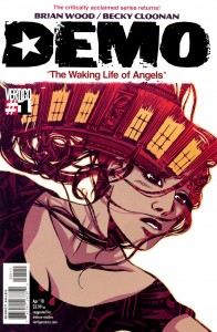 The first Demo series was one of the first “darlings of the comics internet”, released at the time when that phenomenon was getting its feet under it (and a year after I started blogging, myself), due in large part to the efforts of  Larry Young and AiT/PlanetLar, who was one of the first publishers of comics and graphic novels to reach out to those of us who were spending our online time blogging about comics and comics-related subjects, rather than where we went on or summer vacation or what the weather was like where we lived, etc. Demo, originally set to be taken as single issues and not to be collected, was among the AiT titles that Young made available to all of us, and it soon became a buzz book like several others at about that time. Originally an X-book pitch, the series, at first at least, dealt with twentysomethings with extranormal abilities, and their trials and tribulations, but eventually moved away from that, de-emphasizing or leaving the powers thing out all together. The one constant for me with the first series, was how Wood would, seemingly without fail, have his characters say and do things that would utterly defy logic and/or common sense, at least as I (admittedly tenuously) know it…and often the key part of the denouement would hinge on this irrational act…and if not that, that thing guaranteed to drive me up the wall, the ambiguous, make-your-own-because-I-don’t-want-to-think-of-one ending. Some people love that sort of thing, but it makes me insane.