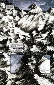 Here, he’s under the IDW wing with horror maven Steve Niles, and they’re once more going to the Shelley well to extrapolate a little on the fate of the Monster and his creator after the events of the novel. Seems the monster has found a home of sorts, as a carnival geek, and we are privy (after a show in which he chases the crowd, who was expecting a flat headed and bolt-necked creature, out of the tent) to him reminiscing about how he came to be, as well as a couple of attempts to end his own life with Victor Frankenstein present to debate the whys and wherefores, a move which does really echo the tone of the source material. I liked the Hammeresque Monster-as-carny idea more than I liked the flashbacks; hopefully future issues will emphasize the former at the expense of the latter. Wrightson, for his part, does a wonderful job; early on, things look somewhat sketchy (with what I’m assuming is a lot of dry brush work that doesn’t flatter his drawing) but about halfway in, during the flashbacks, he comes alive and delivers a little callback to the portfolio days with a drop dead gorgeous three-page ink/wash/indigo snowstorm sequence that reminds me why I loved his art so much back in the day. I posted a page at right; please click to see bigger. As Frankenstein adaptations go, this is familiar territory for the most part, but you never know, Niles might be planning to go off on a tangent at any time…plus, it’s a pleasure to see Wrightson art on a sustained basis. B