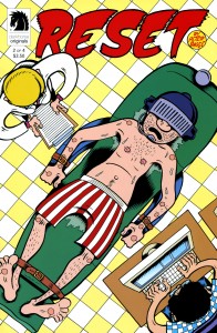Can’t fault Pete for trying to bust out of that Bradleys bag he finds himself in; he’s tried many different vehicles and venues, from the unfunny and forced Yeah! with Gilbert Hernandez to the bland Sweatshop and Apocalypse Nerd, it’s all consistent with his style, but the execution has just seemed off and it’s no surprise that (at least to me) the Hate! Annuals remain his strongest work since, well, he stopped doing Hate on a regular basis. How-ev-uh, as ESPN’s Stephen A. Smith would say, I think that he just may have finally come up with a vehicle suited to his idiosyncratic brand of rancor-laced humor (or is that humor-laced rancor? Anyway.) with the Sci-Fi informed Reset. Reset gives us a not-Buddy-Bradley named Guy Krause, who’s a washed-up sitcom/movie actor and former standup comedian, possibly an amalgam of Pauly Shore, Charlie Sheen, and probably a dozen other candidates, who’s so down on his luck he can’t even get a part in a kiddie show wearing a gorilla costume. While doing his time in traffic school (a “road rage” incident- is that vintage Bagge or what?), he meets a young lady who propositions him (and not in a way he’d like) to gauge his interest in participating in a research project for a tech firm…seems she’s actually a psychologist, y’see, and she wants him to take part in a virtual reality project. Needing the dough, he reluctantly agrees and shows up the next day, gets strapped in, and is thrown into a hyper-realistic scene taken straight from his own memories, all to gauge how he reacts…and as you can imagine, he promptly freaks out. The idea is to get Guy to interact with his past, but he wants nothing to do with it, smelling a psychiatry trap- but the need for money keeps him coming back. As you would expect, it doesn’t go as smoothly as either party plans, and most of the joy in reading this is the back-and-forth between Guy, Dr. Angie, assistant Ted, and the shadowy group of men who are secretly bankrolling the whole project (and keeping Krause unemployed as well), unbeknownst to Guy. Bagge’s Libertarianist leanings inform a lot of this, plus a sideways commentary on the things people are reduced to to find work, and some TV industry satire is mixed in as well…plus, as always, Bagge’s delivers the goods with his idiosyncratic art style, especially when it comes to body english and reaction shots. I had pretty much given up on enjoying anything but the intermittent Hate! Annual from Mr. Bagge, but this (so far, anyway- he still has two issues left to bring it home) is by far the best non-Hate! related thing I’ve read from him in too long to remember, and if that intrigues you, then by all means you should check this out. A-