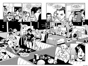 Two things got my attention- first, Hahn the writer pulls off the neat trick of making a hard-to-like character likable; even while shaking my head at the dubious decisions Kit makes, I couldn’t help but hope that things work out for her. She seems to have good intentions, and circumstances keep dragging her back…and who doesn’t identify with that? Even the boyfriend comes across as not a total loser, and that points towards well-rounded characters, always welcome in this sort of thing. Second, Hahn the artist turns in some of the best work of his career here; he still retains his angular, crisp style on his figures, and really steps up his game on their surroundings- check out the detail in this wide shot of the interior of the diner at left, one example of what I’m talking about. I love the range of people depicted, their faces, and the proportions, where they are in the shot- their seats, etc. are all spot-on, with no cheating or cribbing in the rendering. Hahn has a fairly even ink line, but has a good command of black spotting and an expressive style, and I’m thinking it’s a shame we haven’t been seeing more from him on a regular basis.