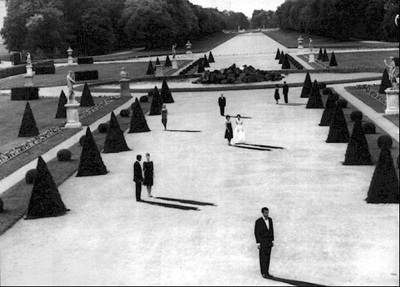 It centers on three characters, unnamed in the film but given designations. X (Giorgio Albertazzi) approaches A (Seyrig, later the star of one of my favorite vampire movies, Daughters of Darkness) at a gloomily beautiful hotel, telling her that they had met last year at Marienbad (in the Czech Republic, though nothing is to be taken too literally). Though A demurs X persists, telling her that she had agreed to leave her husband and run off with him. The cadaverous husband, M (Sacha Pitoeff), appears–but perhaps he is her guardian, or more her caretaker than her spouse. Maybe X and A, who communicate in a stylized, stilted way, were previously acquainted; maybe they’re destined to consummate a relationship based on violence, not love. Who are the other people in the hotel, who for the most part exist to stand in frieze-like compositions and bear silent witness to the triangle? Why do the people, but not the trees, cast shadows in the gardens (pictured below)? Why are the same scenes playing out in different rooms that don’t appear to be in the same hotel? Are we in a hotel, or in a limbo? Is it a dream? A ghost story? Does finding out, or, rather, not finding out, challenge you, or make you wish you’d rented Paul Blart: Mall Cop instead?