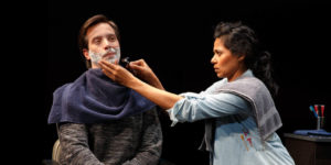 There’s an agenda at play here — Jess has begun to have feelings for John, who is a bit of an asshole, and proudly so. (Majok isn’t sentimental about the disabled, either.) Their story is paralleled by that of a more combustible couple, Ani (Katy Sullivan), who has lost her legs and is mostly paralyzed since an accident, and her patient ex-husband Eddie (Victor Williams). He bathes her, too, in a more tender sequence accompanied by Satie playing in the background. It ends differently (like Ani, Sullivan, whose thick local accent perks up the pre-show announcements, doesn’t seem a Satie kind of gal) and leads to the fusion of the play’s two halves.