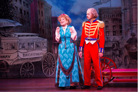 The casting is likewise revivifying. The show is about mismatched lovers brought together haphazardly by New York City matchmaker Dolly Levi, who, having endured widowhood, has a secret yen to marry “half-a-millionaire” Horace Vandergelder, a curmudgeonly Yonkers shopkeeper she’s shopping around. The parts of Cornelius Hackl, Vandergelder’s clerk, and Irene Molloy, the hat shop owner Dolly has promised to introduce to Horace, can be stock, and stiff, in the playing, if the actors don’t have sufficient personality to hold their own against the leads. But handsome Gavin Creel (Hair), who has a Dick Van Dyke-type facility at musical comedy, and the gorgeous red-haired Kate Baldwin (Finian’s Rainbow), are a perfect match, and their scenes hum. Second bananas Taylor Trensch (Matilda), as Horace’s other clerk, the bumbling Barnaby, and Jennifer Simard (a Tony nominee for last season’s Disaster!), playing an unlikely “date” for Horace, score in the funny business between standards. With these reserves of good cheer to draw on, the elaborate mega-number “Before The Parade Passes By” has the audience on its feet well before it closes Act I.
