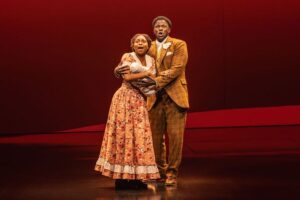 But the music is truly timeless, one enchantment after another as the early jauntiness gives way to terrible tragedy. Not one number is disposable in the three-hour show (though the Houdini bits, as he seeks transcendence, have never really worked). “What a Game” might seem like a flippant charm song about baseball, but it shows Father’s exasperation with the lower orders as he reckons with class warfare on a smaller scale than what he will soon reckon with. “Wheels of a Dream” consolidated the stardom of Tony nominee Brian Stokes Mitchell and Tony winner Audra McDonald as the doomed Coalhouse and Sarah, and looks set to do it again for Henry and Lewis, who mid-song at the preview I attended got standing ovations for their towering performances. (I joined in, though Kai Harada’s audio design needed fine-tuning I’m sure it got before opening.) Henry in particular is raising the roof, holding one final note for an almost supernatural length of time that got us on our feet again. Then again the cast has no weak links, with Levy, Donnell, and Uranowitz firmly anchoring their parts of the show, and I was amused to see Taub, creator and star of the Ragtime-adjacent musical Suffs, repaying the debt as it were as Goldman. As America careens uncertainly toward a 250th anniversary led by a president whose preferred entertainment is cage-fighting Ragtime brings us our shared experience in all its colors, its glory and its terror. Go.