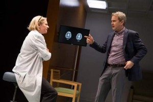 More terse, Lucy Prebble’s British import, The Effect, can’t quite decide what it wants to be. After separate interviews looking for paid volunteers, Connie (Susannah Flood) and Tristan (Carter Hudson) are ushered into a drug testing program examining the effects of antidepressants. Haltingly, given different personalities and outlooks, the two fall in love–or is it just the antidepressants kicking in? Are there antidepressants, or just placebos? What of the doctor (Kati Brazda) administering the trial? Many questions are raised, but despite a hot topic in our age of suspect drug trials and a lot of surface buzz with projections, frequent Barrow Street Theatre director David Cromer (Tribes) can’t find much rhythm in Prebble’s issues-packed storytelling, and the energy levels of Flood (too little) and Hudson (too much) could use adjusting. Brazda is just right, but a shift in perspective can’t make the character any less of a device.