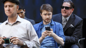 The war on privacy is being tackled downtown at the Public. James Graham’s Privacy, which also closes today, is more of a pillow fight, a fluffy entertainment hosted by Harry Potter–I mean, Daniel Radcliffe, who has found a second career on the New York stage. Co-created by Graham and Josie Rourke, and directed by Rourke, this is an Americanized version of a London hit. Radcliffe is The Writer, who has fled a broken relationship with his boyfriend to start over again in New York. Trouble is, his digital footprint has followed, and complicates his search for more of an identity. With everything available at the touch of his iPhone, he’s lost his sense of self, a dissolution marketers are more than happy to help him with. The supporting cast pops up in various guises, sometimes as real experts in the shifting field of privacy law, who drop a few tidbits about protecting our own records. At play’s, and wit’s, end, no less an authority than Edward Snowden appears, a ghost on the projection screen, to recite from The Tempest and point the way ahead for our confused protagonist.