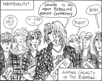 Somewhere along the line I heard about McCloud’s 24-hour comics challenge — it must have been in print somewhere, in those pre-Internet days. It’s a terribly simple idea: produce 24 finished pages of comics — written, drawn, and lettered — in a single day. Twenty-four pages of sequential art, telling a complete story, completed in as many sequential hours, with no significant preparation; just sit down at the blank page at Hour One, and go for it. Spontaneous creation on a par with the Surrealists’ automatic writing.