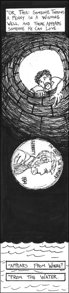 Play with your influences. Every artist has em, and we are interesting as artists primarily in how we process our influences. We may embrace them, presenting ourselves as squarely in a shared tradition; or we may define ourselves by opposition, reclamation, deconstruction. The Deep End comics wound up being a reflexive work, a story about stories, and the influences I had in mind while making them included Neil Gaiman’s Sandman, Gene Wolfe’s Book of the New Sun, Isak Dinesen, Paul Bowles, Meatball Fulton’s audio dramas, Joseph Conrad, T.S. Eliot, Yeats, and Dylan Thomas. It’s all in there, if you know where to look, but the very flavor of the mash-up — its components, its elements, the conscious riffing — comes out reading like me.
