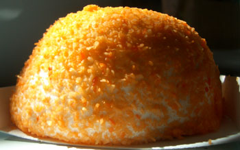 Regular Sno Balls are white (duh) or pink. I keep hoping they’ll come out with yellow ones, because that would be really fucking funny, and maybe they could talk Frank Zappa’s family into letting Hostess use “Don’t Eat the Yellow Snow” for a super-hip ad campaign. Anyway, Glo Balls are fluorescent orange. Witness the Glo Ball in all its foul glory: