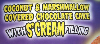 Veteran Hostess consumers will recognize “Glo Balls” as cleverly transmuted Halloween versions of “Sno Balls,” which, if you aren’t familiar with them, consist of cream filling inside chocolate cake which has been covered with marshmallow and coconut. Like many Hostess desserts, they look mighty fine if you’re running on an empty stomach and jonesing for some quick energy. Like all Hostess desserts, they are not mighty fine. Matter of fact, I happen to think Sno Balls are the absolute worst Hostess has to offer. They’re maybe 20% cake; you bite in expecting some marshmallow-topped chocolatey goodness, but all you get is a foamy mouthful of sugar.