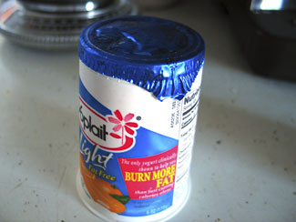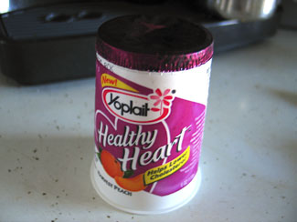 In yogurt news, Yoplait has started making something called ?Healthy Heart? yogurt, which ?may lower cholesterol? due to something called ?fruit sterols.? I?ll try almost anything new, so I bought some. It tastes the same, and I don?t feel like my cholesterol has decreased. But more annoying is Yoplait?s senseless removal of the Handy Removal Tab on the foil lid. Observe: