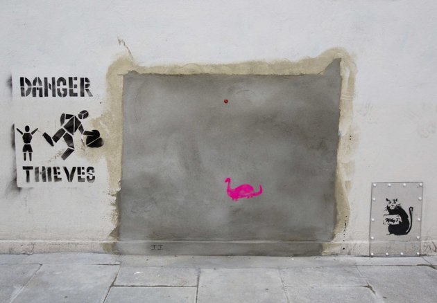 In 2007, London transit workers mistakenly painted over Banksy’s famous Pulp Fiction mural showing Samuel L. Jackson and that Scientology guy holding bananas instead of guns. A Transport of London spokesman was unapologetic: ”Our graffiti removal teams are staffed by professional cleaners, not professional art critics.” Cor blimey, guv’nor! Over the years, countless Banksy works have been erased, defaced or disgraced. There’s a good Wikipedia entry about that here.