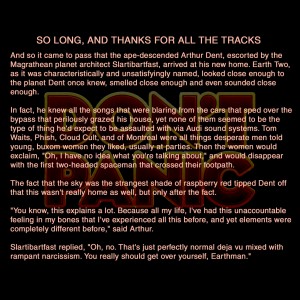 One last thing.  At the end of the third volume of the mixtape I included Pink Floyd’s “Shine On You Crazy Diamond” as a “dedication” track that I thought had no particular relation to The Hitchhiker’s Guide to the Galaxy excepting that Douglas Adams was a big fan of the band.  As commenter Joncwriter pointed out, that song was actually used in the original BBC radio series but omitted from the released recordings due to licensing issues.  I had no idea – it’s entirely a coincidence that I chose that particular track, which seems wonderfully appropriate because it’s these kind of coincidences that Douglas Adams seemed to really enjoy.