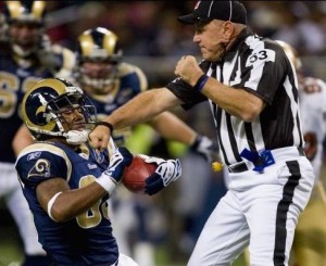 4. Garth DeFelice vs. Kenneth Darby. Garth DeFelice doesn’t sound like a linebacker’s name, does it? It’s not. DeFelice was a referee working the umpire position in a game between the St. Louis Rams and the San Francisco 49ers. After Mark Bulger dumped off a short pass up the middle to Kenneth Darby, the running back tried to keep DeFelice between himself and a potential tackler, but ended up running into his forearm instead. While there was no malicious intent on either side, it made for a pretty amusing moment and a terrific still photograph (click on the photo for the full version).