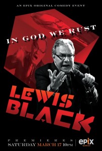 Lewis Black, the acerbic comedian, actor and author has a new comedy special premiering Saturday Night, 3/17/12. In God We Rust will begin airing on EPIX, the same Internet channel where his 2009 show, Stark Raving Black continues to be a hit.