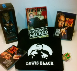 Prizes include: an autographed poster and a dreidel; a Lewis Black t-shirt; a DVD copy of Stark Raving Black, a CD copy of Stark Raving Black; a copy of Black’s book, Nothing Sacred; and a Lewis Black bobblehead doll.