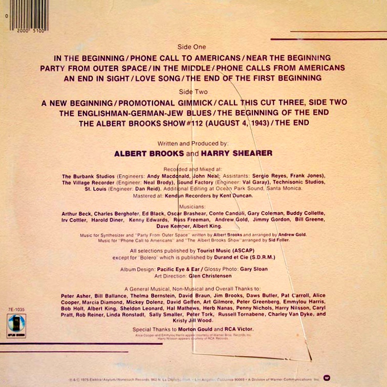 Harry Nilsson can be heard as “Lassie” (the first time around, anyway — Andrew Gold, who’s credited on A Star Is Bought‘s back cover with arranging the fakes, may be the famous collie near the end of the track); Linda Ronstadt, who dated Brooks during the two-year gap between Comedy Minus One and A Star Is Bought, is “Al Jolson”; and Micky Dolenz, a fellow friend of Nilsson and John Lennon’s during the latter’s 18-month “lost weekend” in L.A., seems to be the one singing “no no no” when asked if he’s a celebrity. Harry Shearer’s golden throat makes its presence known as well.