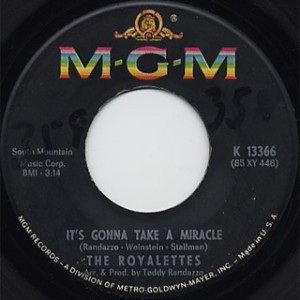 “It’s Gonna Take A Miracle” rose to #41 on the Billboard Hot 100, and #28 on the R&B chart. That same year Randazzo gave the Royalettes a smaller hit with “I Want To Meet Him.” He provided them with a big, fully orchestrated sound on the two MGM albums that he produced and arranged for the group. Despite all of the attention that was lavished on their records, and the positive reviews for their live shows, the Royalettes never achieved major success. The Baltimore quartet tried one more single, this one produced by Righteous Brother Bill Medley, but it didn’t go anywhere. They left MGM for Roulette Records in 1967, and broke up two years later.