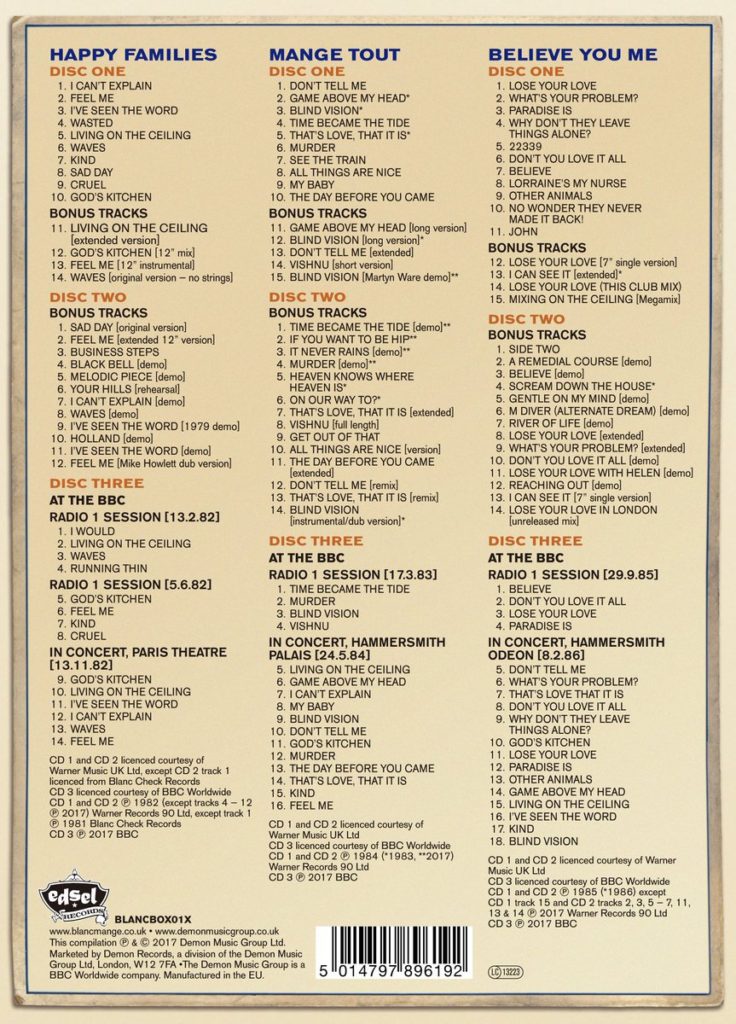 In between the two releases, Edsel released The Blanc Tapes, a 9-disc box set spotlighting Arthur’s first three Blancmange albums with Rhodes and keyboardist Stephen Luscombe. Most of the b-sides and rarities were previously released on earlier reissues of Happy Families, Mange Tout and Believe You Me — this set adds fresh liner notes, BBC radio sessions and concert recordings. Each of these albums are also sold separately as 3-disc reissues.