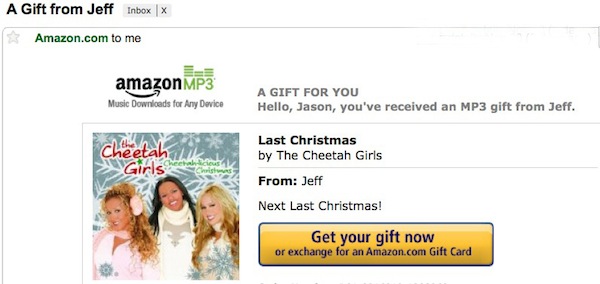 Jason: Okay, that’s over. Quick, fire up the Cheetah Girls before I think too hard about it and jump out my window. Why can’t I just click “Exchange for an Amazon gift card”? I wish I didn’t have this compulsion to listen to everything you send me. Why don’t YOU have that compulsion?