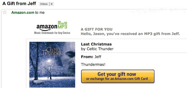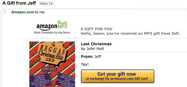 Jeff: Which one of us is combing the Amazon MP3 store for versions of “Last Christmas” and buying them for the other?