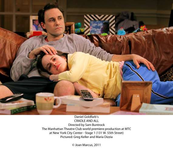 Claire and Luke seemingly have it all in their schmancy Brooklyn Heights digs. They are good looking, well dressed, and professionally successful (more or less). In their mid to late 30s and together five years, they are unmarried and don’t appear to have plans of settling down into a traditional domestic situation. This would be fine, except that Claire desperately wants a baby. Across the hall, Annie and Nate negotiate parenthood, as the proud and burned out parents of an 11-month old. Their life has taken a drastic turn to poopy diapers and plastic teething toys, although music posters on the walls echo of their past, hipper life. Annie and Nate’s disheveled existence is the antithesis to Claire and Luke. The couples are well acquainted with each other, and throughout Cradle and All, grass-is-always-greener references are made to a very different lifestyle.