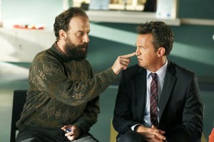 Go On had the good fortune of premiering during NBC’s coverage of the summer Olympics. The premiere airing of the pilot did well in the ratings, giving NBC hope that they may finally have another hit on their hands. Perry stars as Ryan King, a popular radio sportscaster whose wife was killed in a car accident. The series opened with Ryan returning back to work, only to be told by his boss, Steven (John Cho, always great) that he must seek grief counseling or he can’t sit behind the mic. Ryan complies and winds up at a community college therapy group. Before you can mutter Community, we meet the characters. They include: Anne (Julie White) is a lesbian whose partner died and she’s stuck in the anger phase; George (the great Bill Cobbs) is old and blind; Yolanda (Suzy Nakamura) is dealing with the divorce of her parents; Owen (Tyler James Williams) is a young man trying to deal with a devastating accident that put his brother in a coma; and Mr. K (Brett Gelman, pictured with Perry) a mysterious group member that everyone is hesitant to talk to. Gelman has the potential of being a breakout star with this role. The group is led by Lauren (Laura Benanti), who uses new age philosophy, much to the chagrin of Ryan.