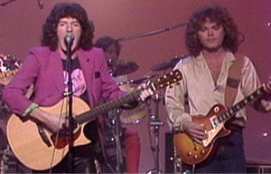 My memories of The Midnight Special are vague at best—I wasn’t quite eleven years old when it went off the air in 1981—but there are definitely hallmarks that are familiar to me, particularly those big red letters that spelled out the performers’ names at the back of one of the three stages the show employed. As an REO fan, I recall the band’s impossibly long name spelled out in those red letters in a photo inside their first A Decade of Rock and Roll collection (I also recall the so-close-you-can-count-nose-hairs zoom-in shot of Kevin Cronin during their 1978 performance of ”Roll with the Changes.” Sadly, this is not included in the DVD box). Any popular music was fair game to be featured on the show, from John Denver’s pageboy haircut (accompanied by Denver himself, and by Cass Elliott) on the show’s pilot episode, to the stadium-filling rock dawgs like Aerosmith and Nugent, to disco floor-fillers like the Bee Gees, Village People, and Chic.
