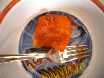 This stuff looks okay enough on the surface, I guess. Kind of like the old-fashioned Boyardee ravioli from my youth, but with a pepperoni odor. A not altogether pleasing pepperoni odor, I hasten to add, but The Boy didn’t seem to notice. “WHEN WILL IT BE DONE?” he asked. “I WONDER IF I’LL LIKE IT. DO YOU THINK I’LL LIKE IT? I’M GOING TO TRY SOME.”